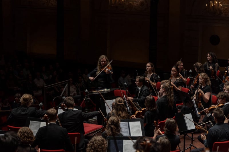 Een ensemble van het Sweelinckorkest bracht een muzikale groet aan de academische gemeenschap van de UvA. Het octet staat onder leiding van waarnemend dirigent David de Goede, oud-lid van het Sweelinckorkest en leerling van dirigent Konradin Herzog.